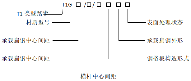 舉例:T1G253/30/100PG以上規(guī)格是采用25×3普通平面型扁鋼,扁鋼間距為30mm,橫桿間距為100的熱鍍鋅T1`踏步板。